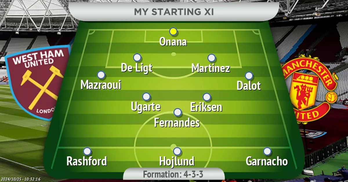 锋线上,霍伊伦应该会首发,在他两侧是拉什福德和加纳乔。门将位置,奥纳纳将和往常一样继续首发。