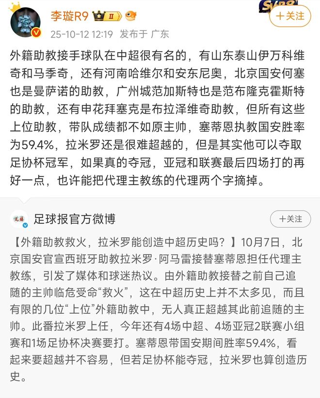 对此,《足球报》总编李璇在个人社媒进行了分析,表示拉米罗只要带领北京国安夺取足协杯冠军,然后再把亚冠和联赛最后四场打的再好一点,拉米罗也许能把代理主教练的“代理”两个字摘掉。