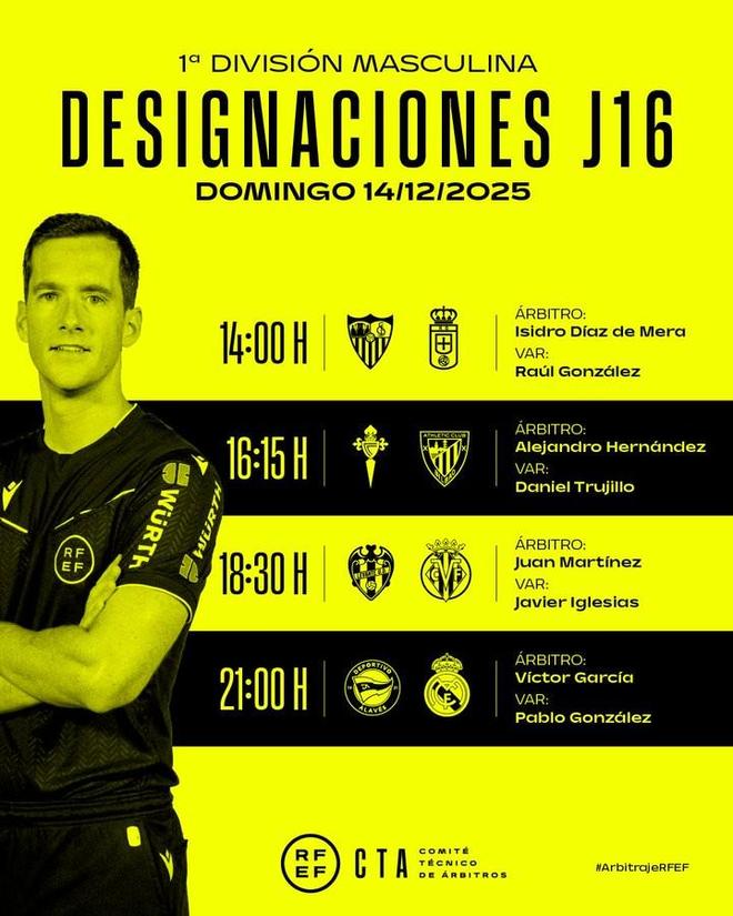 北京时间12月13日,西班牙足协公布了西甲第16轮明日4场比赛的裁判名单,维克托-加西亚执法皇马客战阿拉维斯。